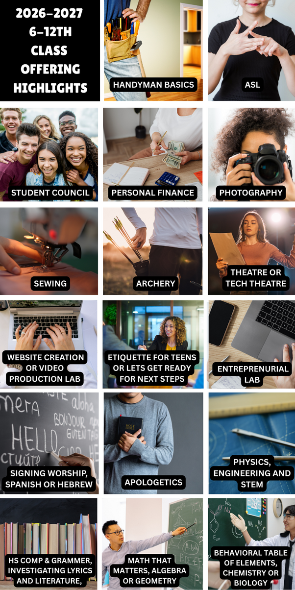 Our 2026-2027 Class Schedule is available and we are offering over 130 unique classes for the coming year! If you click on the individual class you can see more information about that class and what tuition costs would be. All of our in person classes meet on Mondays but some of our online classes meet other days.